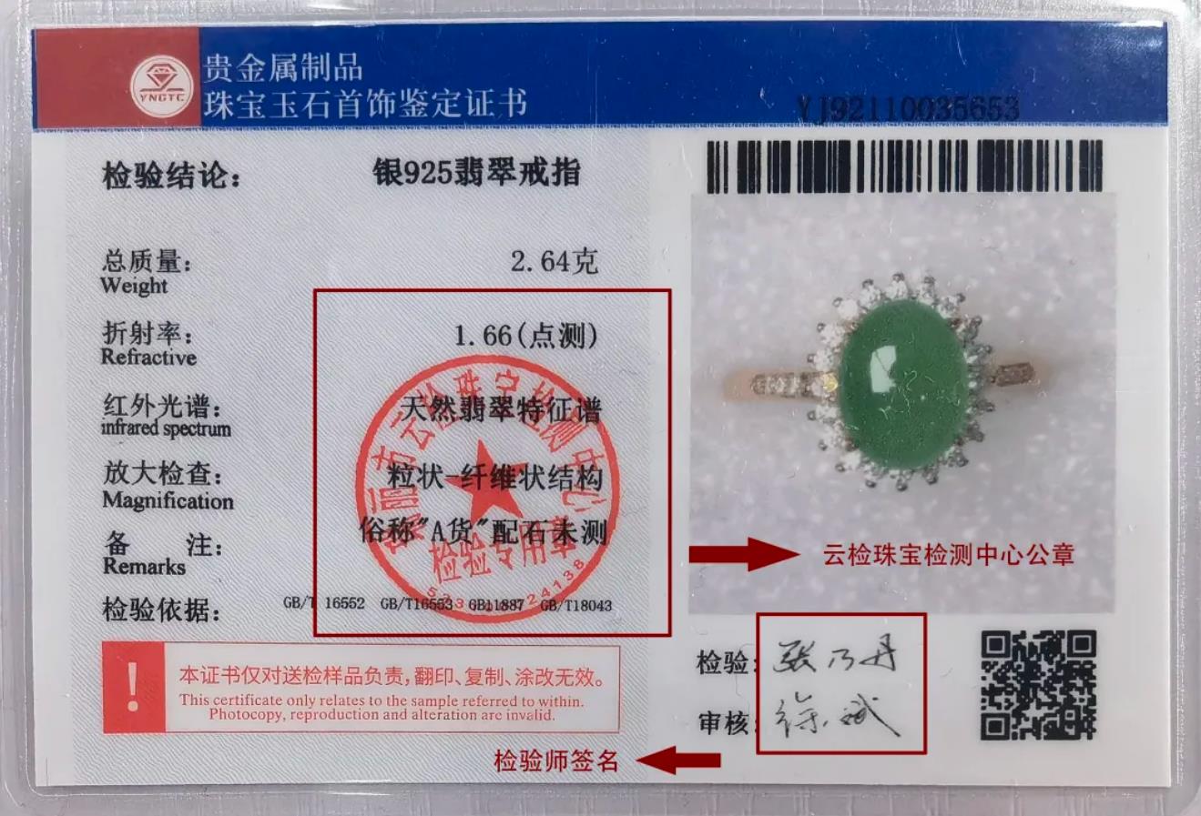 低调看球珠宝玉石首饰鉴定证书背面有单位公章和检验师签名